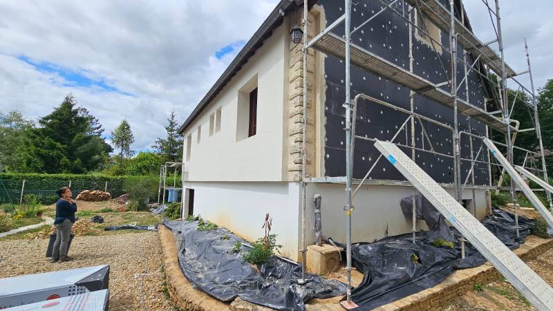 L'intégralité de cette maison ancienne a pu bénéficier d'une nouvelle isolation plus performante, y compris un étage sous pente. Le sous-sol semi-enterré ne nécessitait pas d'isolation, nous avons donc choisi d'effectuer des travaux d'ITE sur la partie pièces de vie uniquement, ce qui permet de réaliser des économies de chauffage toute l'année, tout en limitant les dépenses liées à l'isolation. Nos clients ont également pu bénéficier d'une aide d'Etat pour financer leur projet, notamment grâce à MaPrimeRenov.